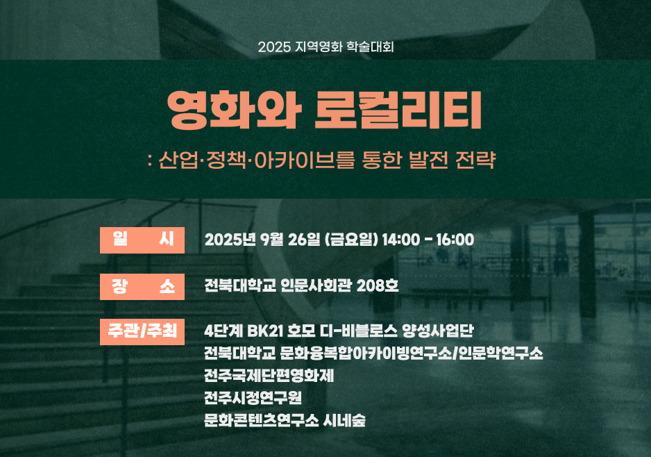 '2025 지역영화 학술대회- 영화와 로컬리티: 산업·정책·아카이브를 통한 발전 전략'을 안내하오니 재학생 및 관심 있는 분들의 많은 참여 바랍니다.