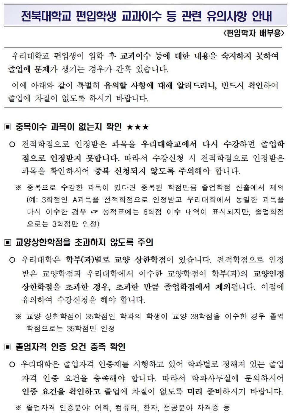 [학사관리과]전북대학교 편입생 교과이수 등 관련 유의사항 안내