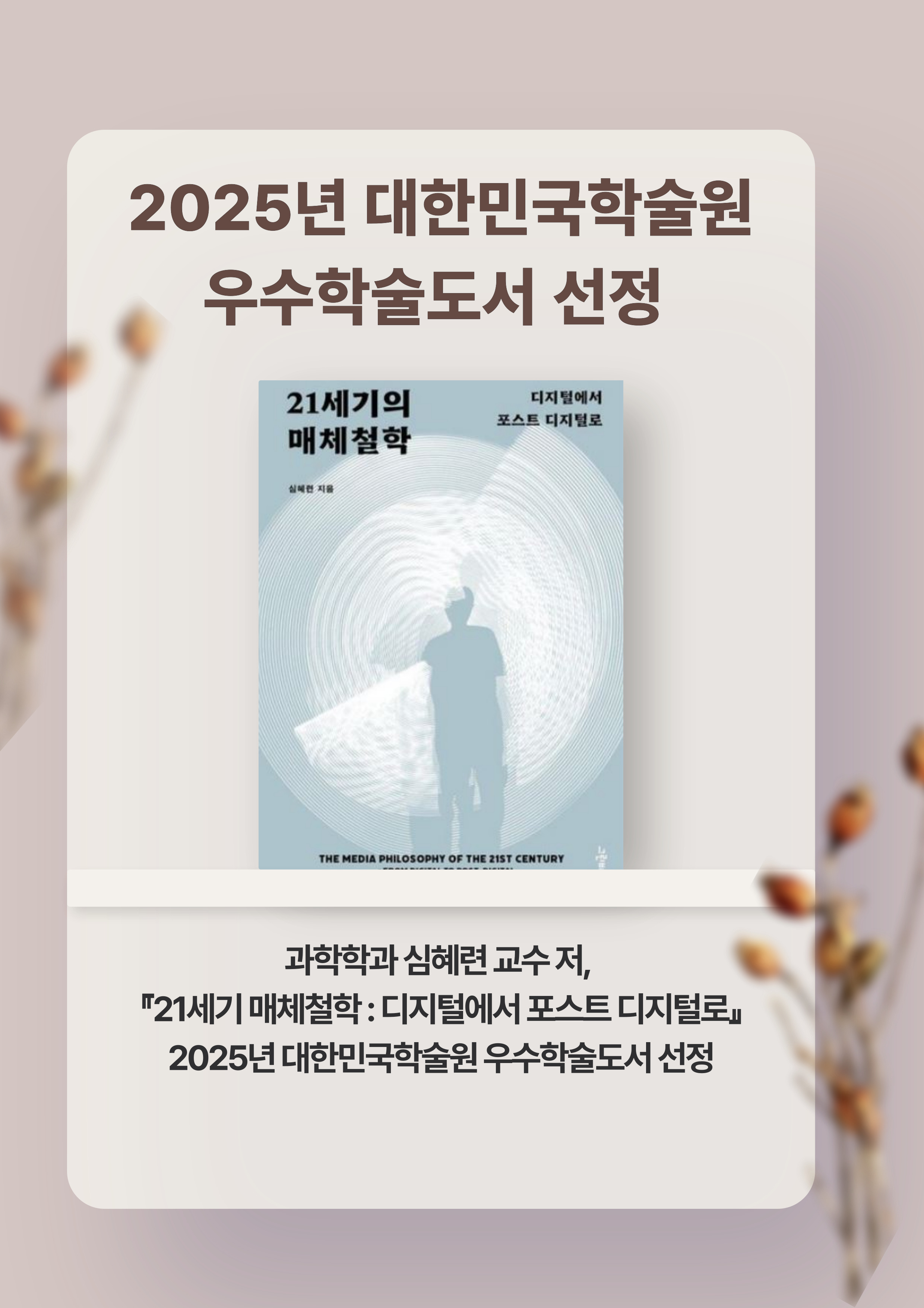 심혜련 교수님께서 집필하신 『21세기 매체철학 : 디지털에서 포스트 디지털로』가 2025년 대한민국학술원 우수학술도서로 선정되었습니다.