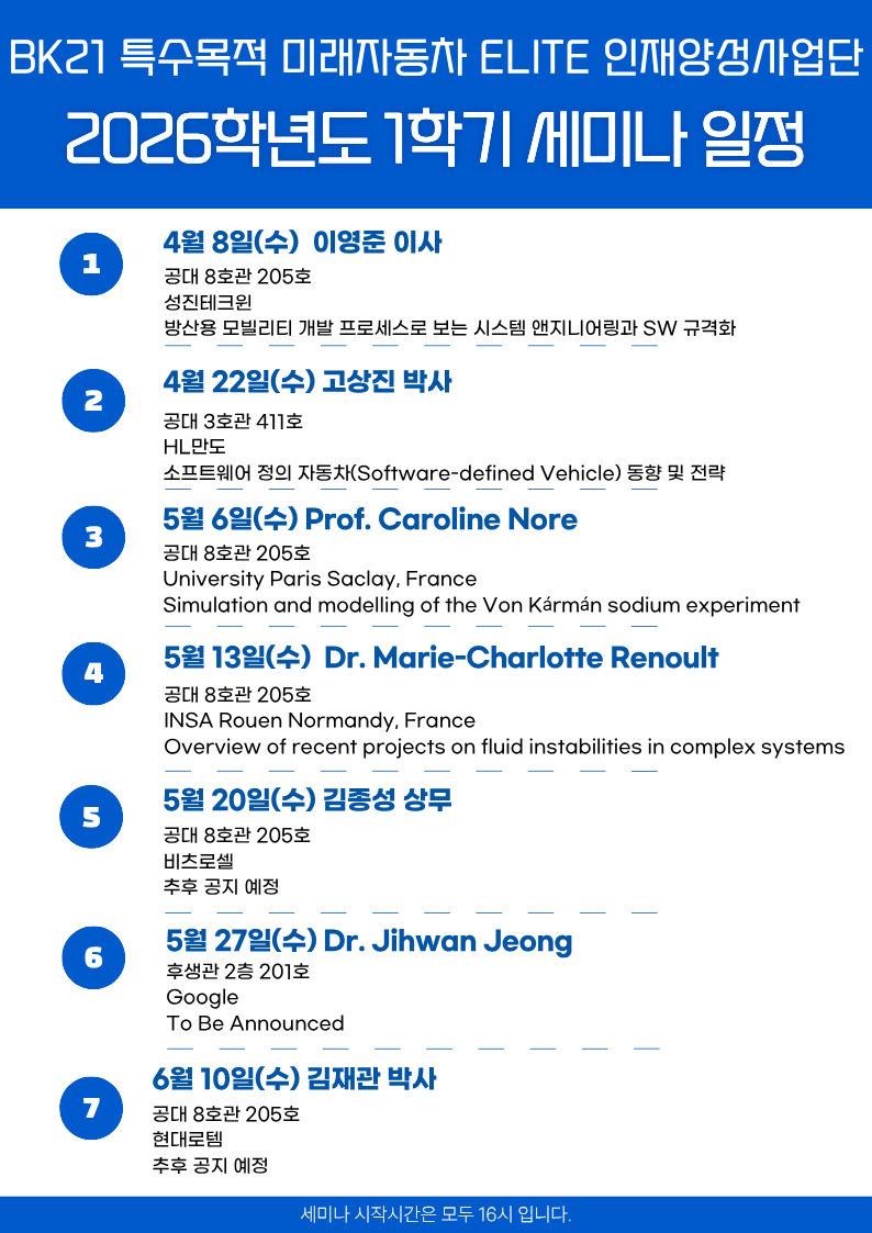 2026년 1학기 BK 21 특수목적미래자동차 ELITE 인재양성사업단 세미나 일정 수정 안내