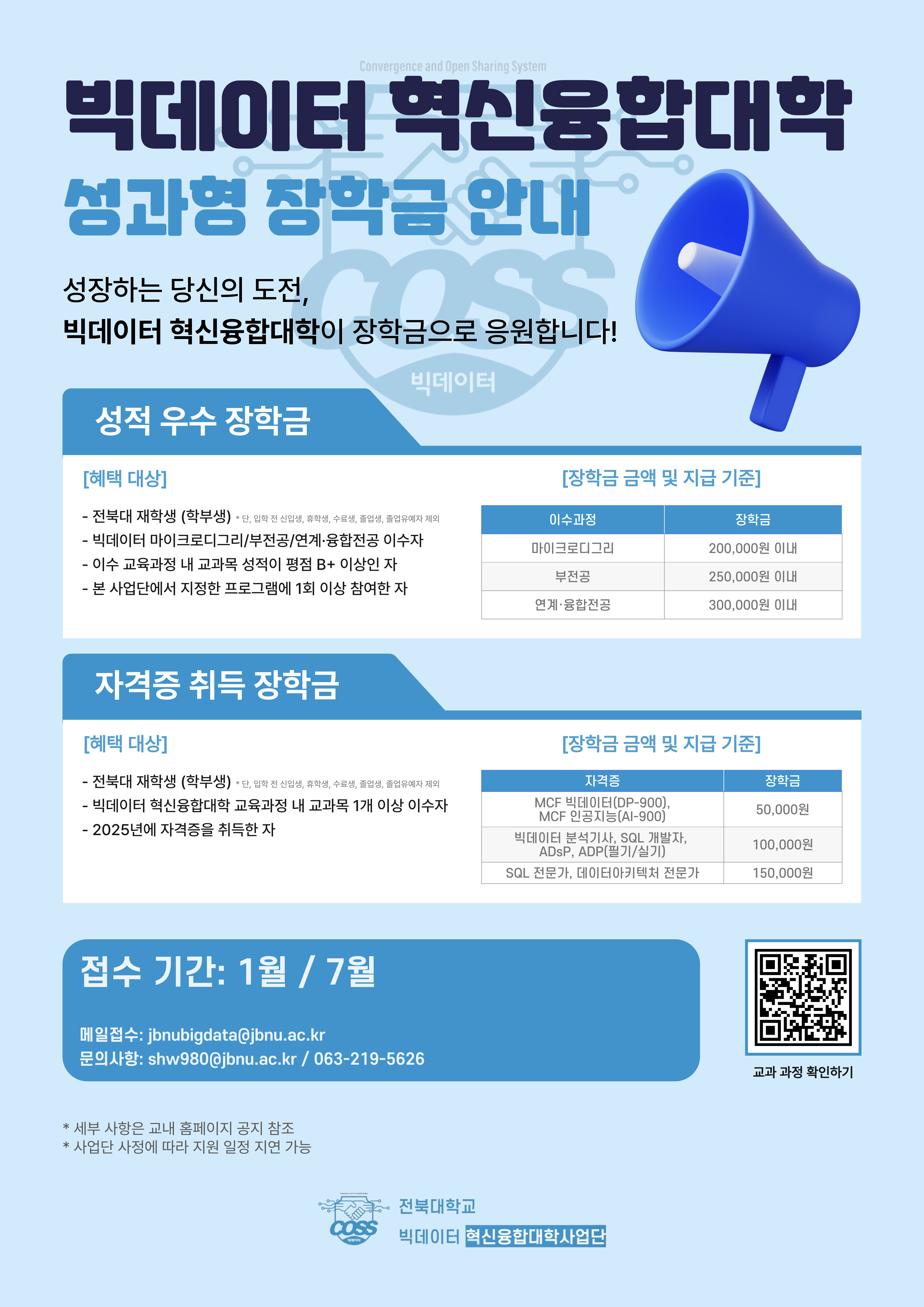 fnctId=bbs,fnctNo=1389 분류 빅데이터사업 작성일 2026.01.19 수정일 2026.01.19 작성자 과학학과 조회수 199 [빅데이터 혁신융합대학] 2025학년도 2학기 성과형 장학금 안내 사업단 지정프로그램 : 과학기술학-빅데이터특별강연 참여도 가능 첨부파일 붙임2. 성과형장학금(자격증취득) 안내(2025-2).hwp 붙임1. 성과형장학금(성적우수) 안내(2025-2) (1).hwp