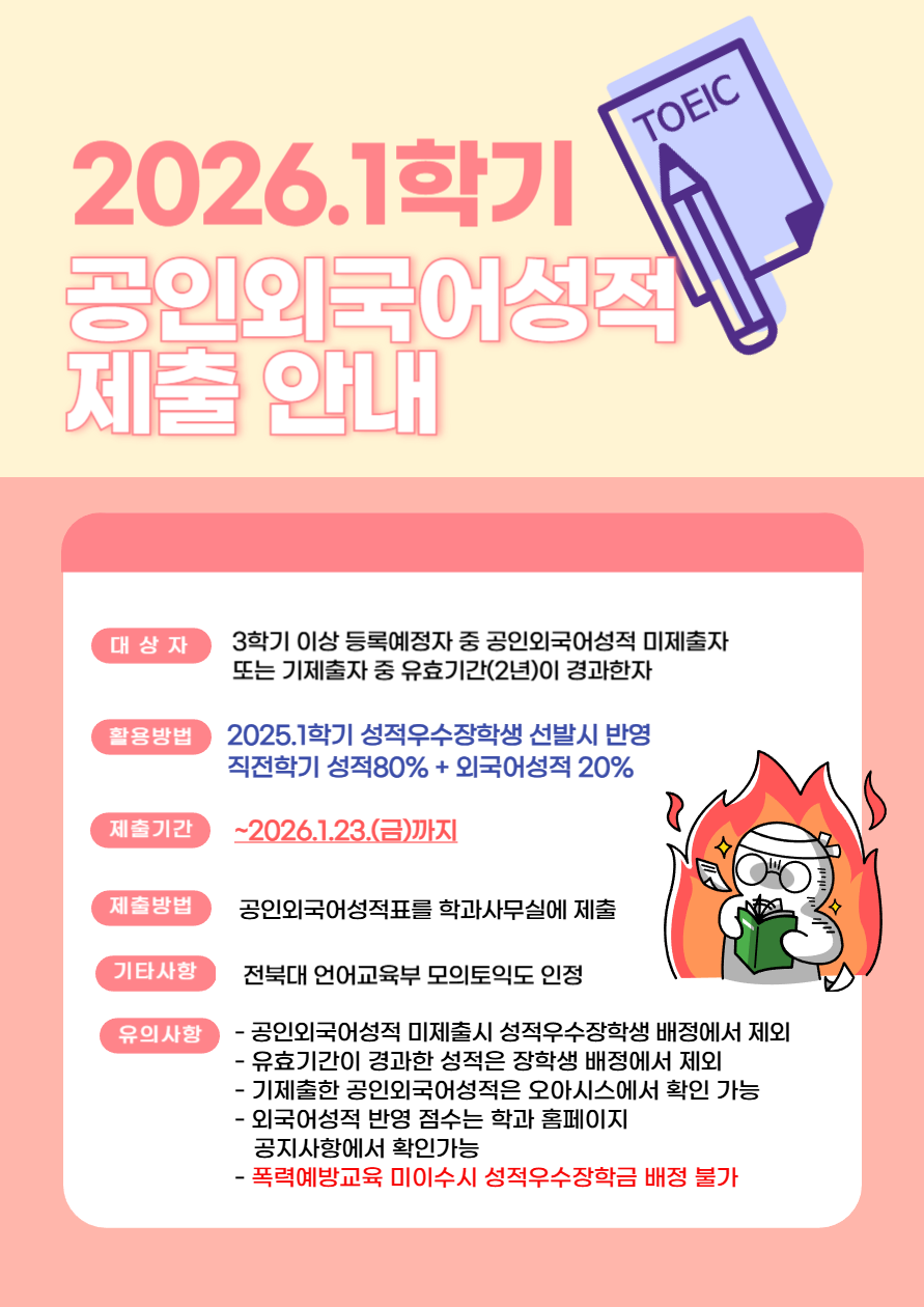 fnctId=bbs,fnctNo=1389 분류 장학 작성일 2026.01.19 수정일 2026.01.19 작성자 과학학과 조회수 208 2026학년도 1학기 성적우수장학생 선발을 위한 공인외국어성적 제출 안내(~1.23(금)까지) 첨부파일 공지사항 용.pdf